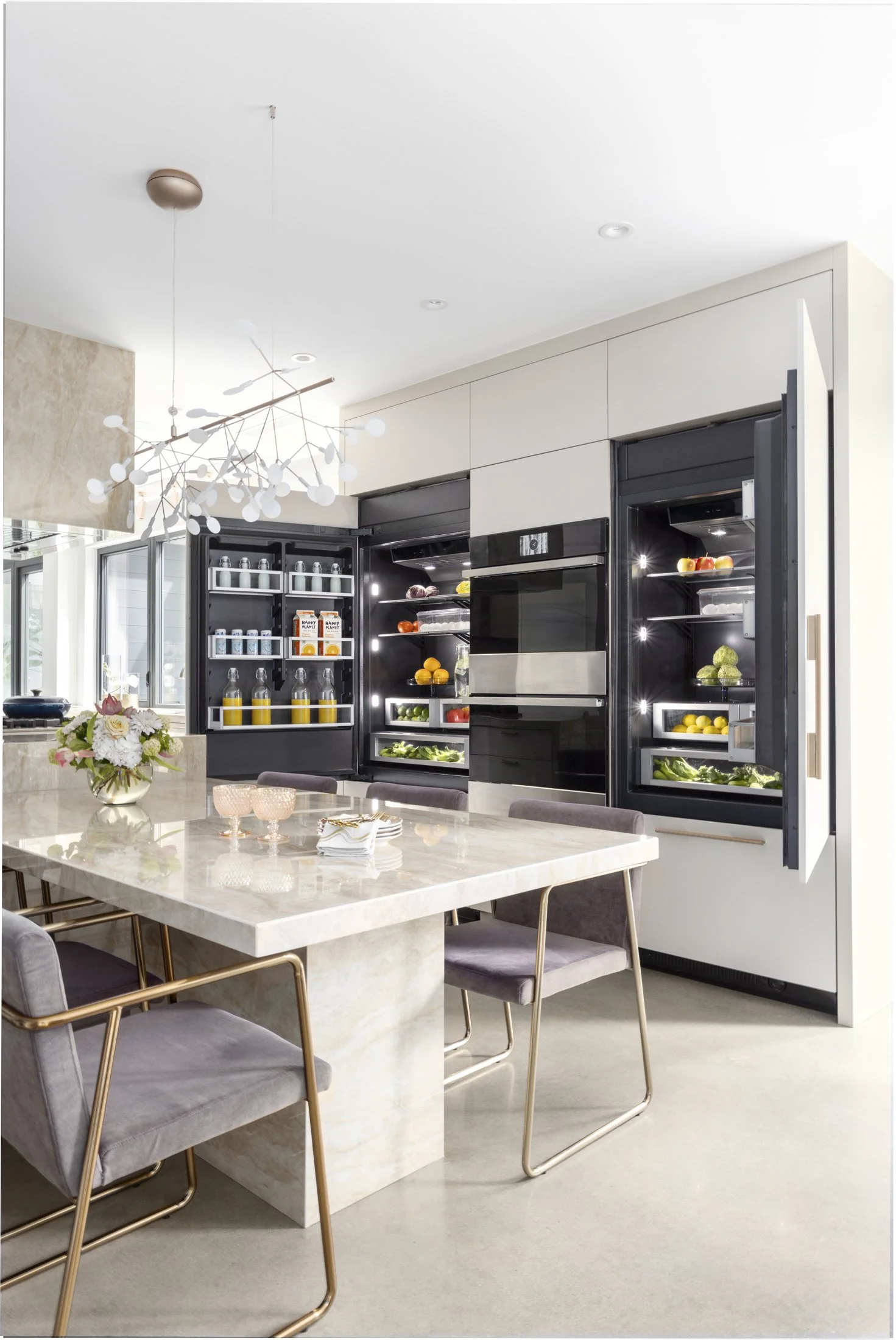 The JennAir appliances we selected include a stunning 36” six-burner gas cooktop, anchored beneath a custom architectural hood fan that disappears elegantly into the design. Central to the main wall are dual stacked ovens, perfectly positioned for efficiency and visual symmetry. Flanking the ovens are two 36” integrated refrigerators with matching custom cabinet panels, their interiors revealing a rich matte obsidian finish illuminated by soft, sophisticated lighting. Every detail from the powerful gas burners to the cool, dramatic interiors of the fridges brings an intentional layer of luxury to daily life.